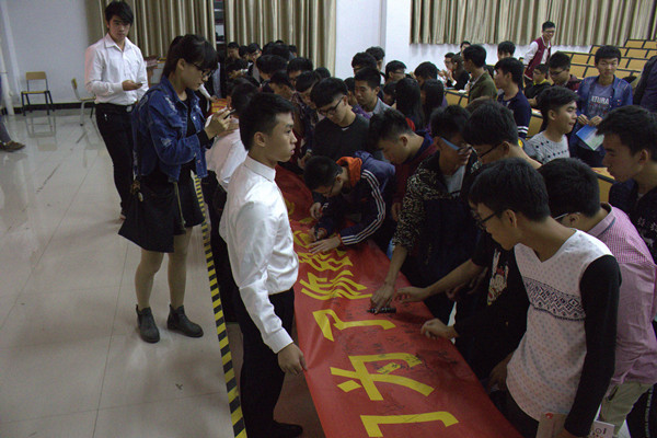 进行大会最后一项,签字仪式。先由周勇老师跟梁聪睿老师为我们带头签名宣誓,接着由每位团学干部和班级干部陆续上台签字。签字结束后,团学干部进行合影留念。