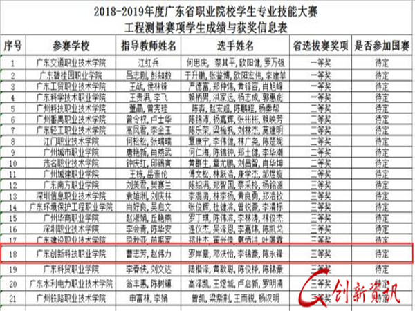 此次竞赛与国赛接轨,比赛的赛项、赛制、比赛时间都发生重大变化。两个月备战期间,在建筑工程系陈玉中主任的领导下,两位指导老师与四位参赛队员勤学苦练,团结协作,最后荣获广东省团体三等奖。此次竞赛,成败关键在于二等水准测量,四位参赛队员竞赛时心态平和,二等水准赛项没有二类,才使得我们能够有资格参与总分评奖,创造了我校参赛以来总分获奖的历史新纪录。