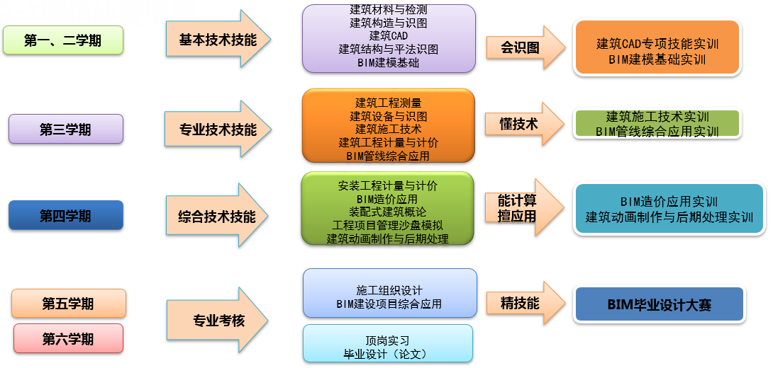 本专业主干课程基本采用企业真实项目进行实操训练。主要课程有建筑构造与识图、建筑CAD、建筑结构与平法识图、BIM建模基础、BIM管线综合应用、安装工程计量与计价、BIM造价应用、工程项目管理沙盘模拟、建筑动画制作与后期处理、施工组织设计、BIM建筑项目综合应用、建筑设备与识图、建筑施工技术、建筑工程计量与计价顶岗实习及毕业设计等。
