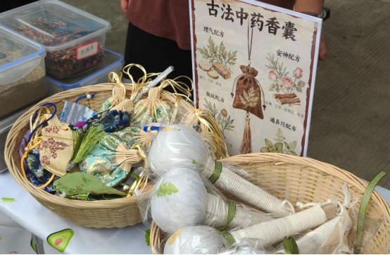 此次集市设有数十个摊位,产品亮点纷呈。中药香囊香牌香气雅致,兼具驱蚊、安神功效;手串香珠、药材耳环将传统药材与时尚设计结合,成学子新宠;药材小挂件造型精巧,蕴含文化寓意。此外,含艾草、薰衣草的蒸汽眼罩可舒缓眼疲劳,搭配罗汉果、胖大海的养生茶包兼顾美味与养生,均备受青睐。学生化身“小讲师”,讲解药材性味归经与功效,成为流动的“中医药科普课堂”。